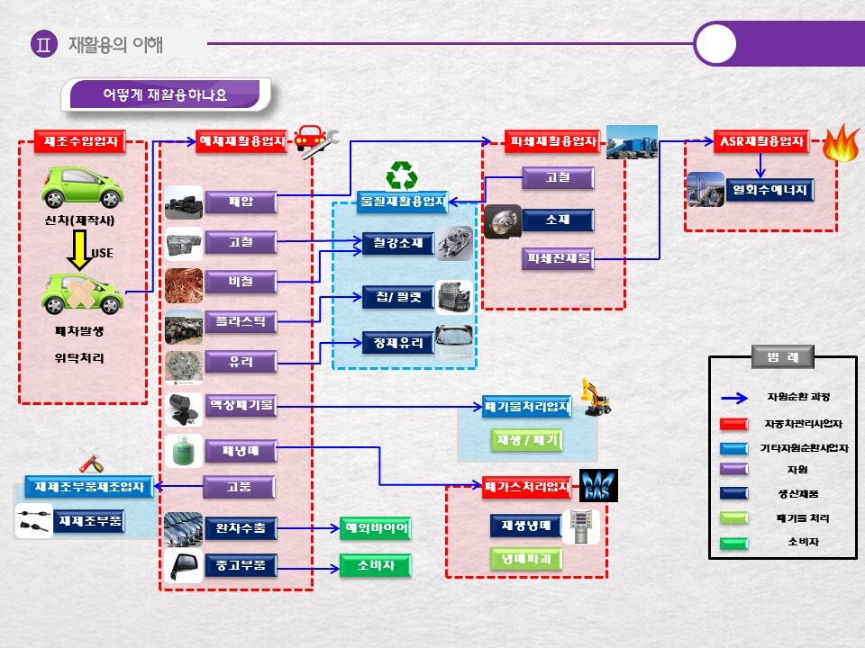 폐차의 재활용은 [전기ㆍ전자제품 및 자동차의 자원순환에 관한 법률]에 따라 처리하게 되는데 국내법 상 95%의 자원회수를 달성화하는 것이 의무화되어 있습니다. 그렇기에 70%에 달하는 고철 이외에도 재활용할 수 있는 모든 것을 재활용해야 하는 것은 당연한 일이 될 것입니다.