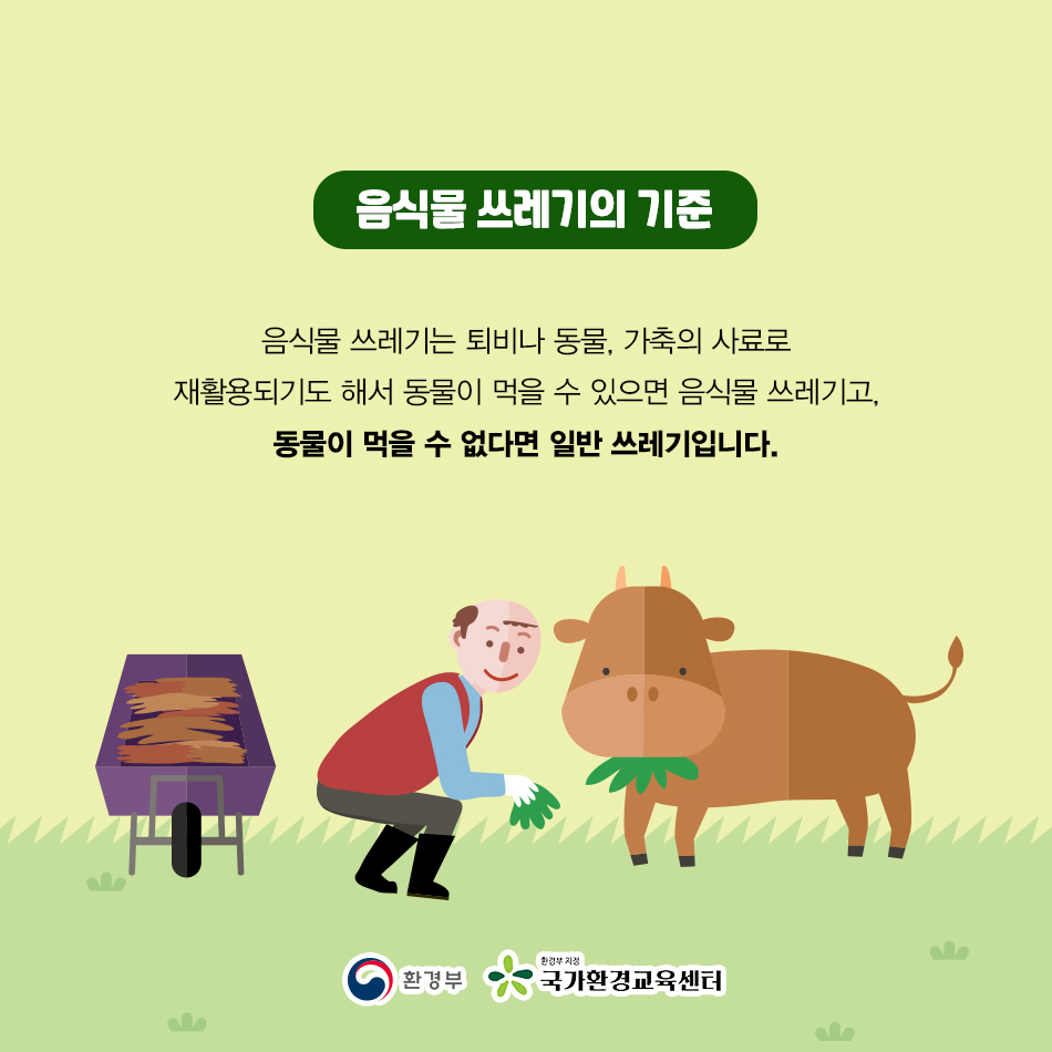 소나 돼지가 먹는 사료로 만들어지는 음식물쓰레기. 함께 사는 지구에서 동물들을 위해 우리가 음식물쓰레기를 버리는 기준은 무엇일까요? 간단합니다. 우리가 먹을 수 있는 것들을 기준으로 버리시면 됩니다.