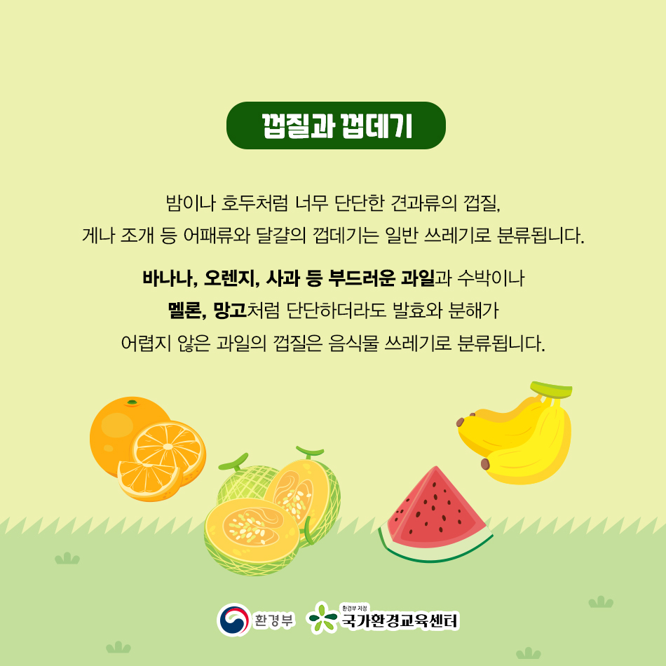 과일과 채소를 먹게 되면 가장 많이 나오는 쓰레기가 바로 껍질입니다. 어패류도 마찬가지이지요.
