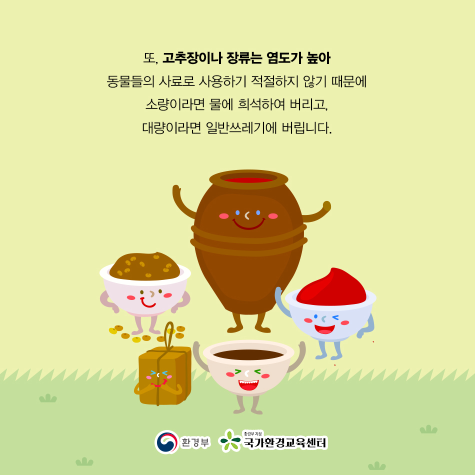 집에서 만든 맛있는 고추장, 된장은 아쉽게도 염도가 너무 높습니다. 인간들에게 맛있는 음식재료가 될 수 있을지 모르지만 동물에게는 여러가지 질병의 원인이 될 수 있겠지요.