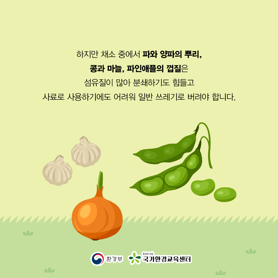 꼭 부드럽다고 다 음쓰가 되지는 않습니다. 특히 마늘, 양파, 쪽파 등의 뿌리는 동물이 소화하기 힘들기 때문에 일반쓰레기로 분류하셔야 합니다. 섬유질이 많기 때문에 분쇄도 힘들고 소화도 힘들기 때문입니다.