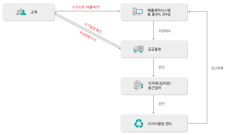먼저 고객은 배출예약시스템을 통해 예약일정을 잡게 됩니다. 시스템을 통해 물류회사에 배차를 지정하게 되면 물류업체와 고객의 협의하에 방문수거를 실시하게 됩니다. 수거한 전자제품은 집하장에서 분류하여 리사이클링센터를 통해 다시 소중한 자원으로 재탄생하게 되는 것이지요.