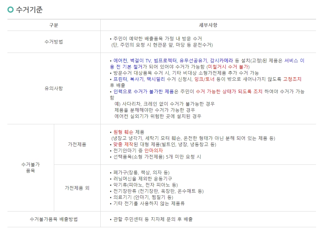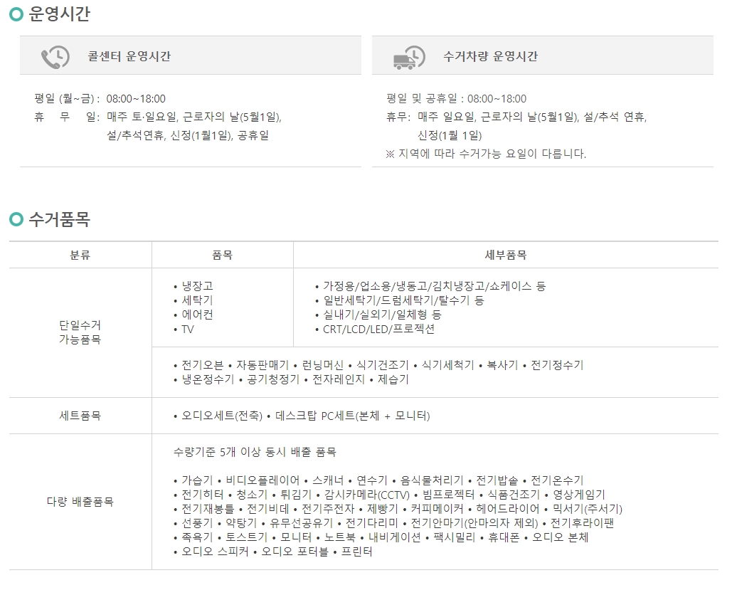 배출품목에 대해서도 작은 가전은 5개 이상되어야지 수거가능한 품목도 있으니 꼭 확인하셔야 합니다.
