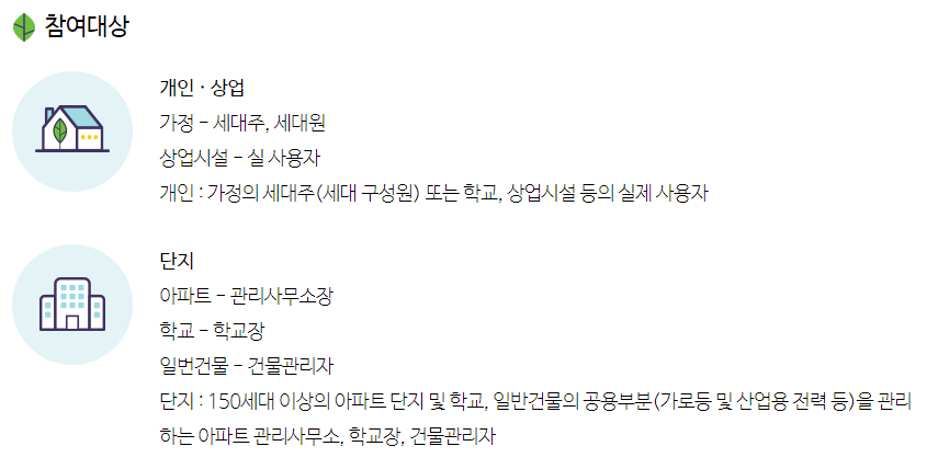 참여대상은 가정 및 상업시설, 아파트, 학교, 일반건물 등 대부분의 시설들이 포함됩니다. 실제 전력량과 수도, 가스검침이 가능한 지역이라면 누구든지 신청할 수 있습니다.